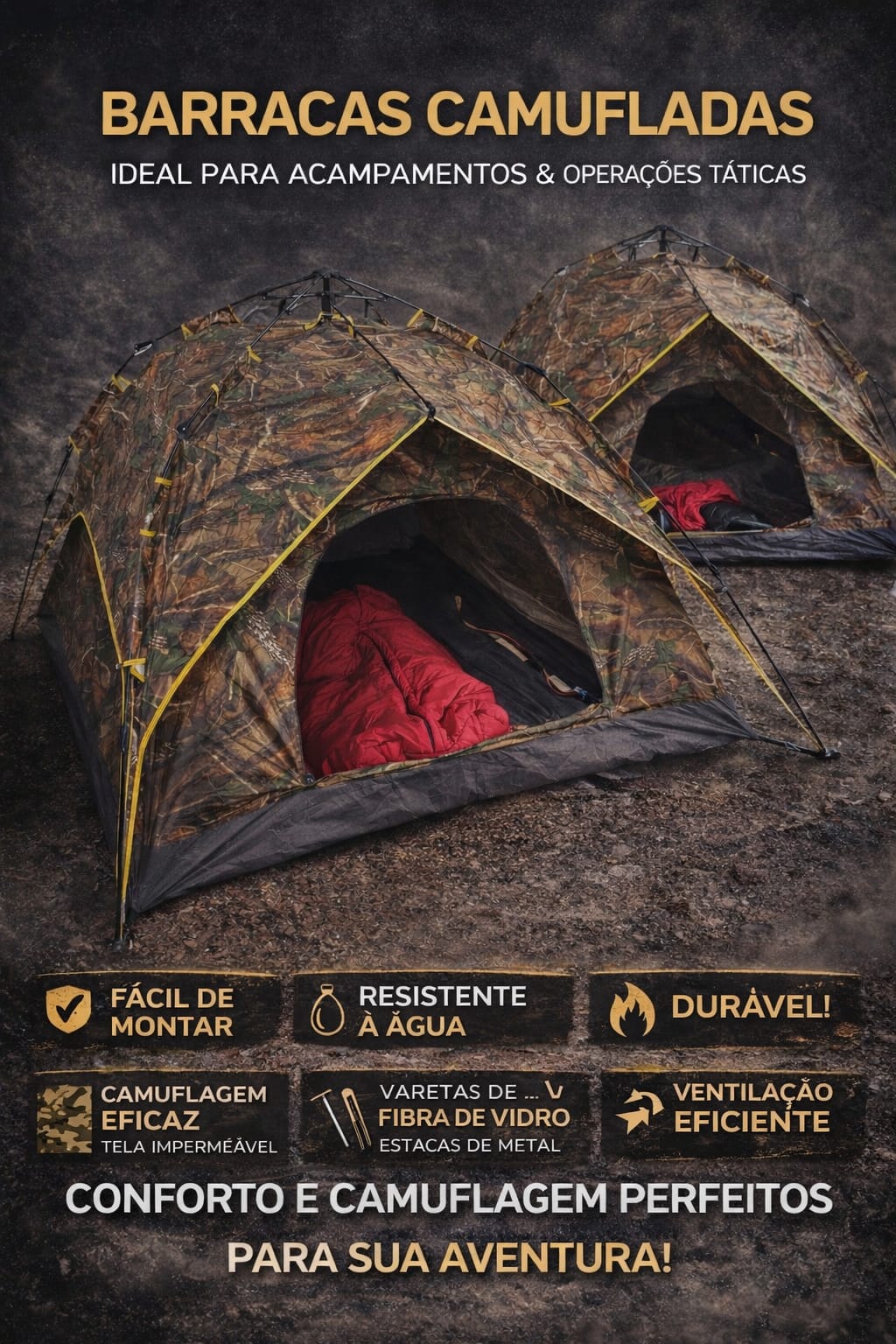 Apresentamos a Barraca Tática Camuflada com Kit Completo, desenvolvida para quem leva desempenho e resistência a sério — seja em operações, camping ou aventuras outdoor.